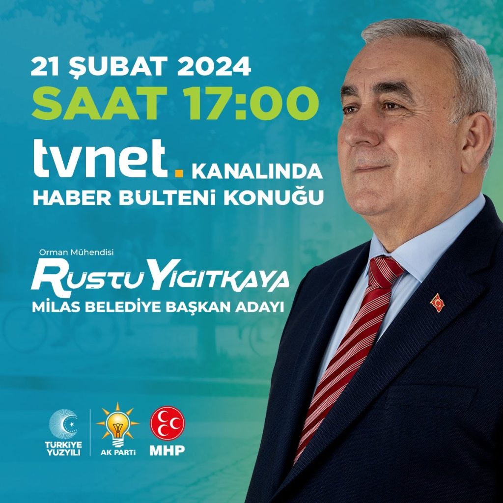 Yerel seçimlerin yapılacağı 31 Mart’a sayılı günler kala siyasi partilerin belediye başkan adayları da seçmene ulaşmak adına tüm medya iletişim kanallarını ve sosyal medya hesaplarını kullanarak kendisini, projelerini ve hedeflerini açıklıyor. Cumhur İttifakı’nın Milas Belediye Başkan Adayı Rüştü Yiğitkaya da, 21 Şubat 2024 Çarşamba günü saat: 17.00’de tvnet adlı televizyon kanalında, hafta içi her gün yayınlanan ‘Haber Merkezi’ adlı programa konuk olarak katılarak, projeleri ve hedeflerini detaylı bir şekilde anlatacak.