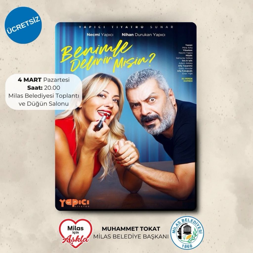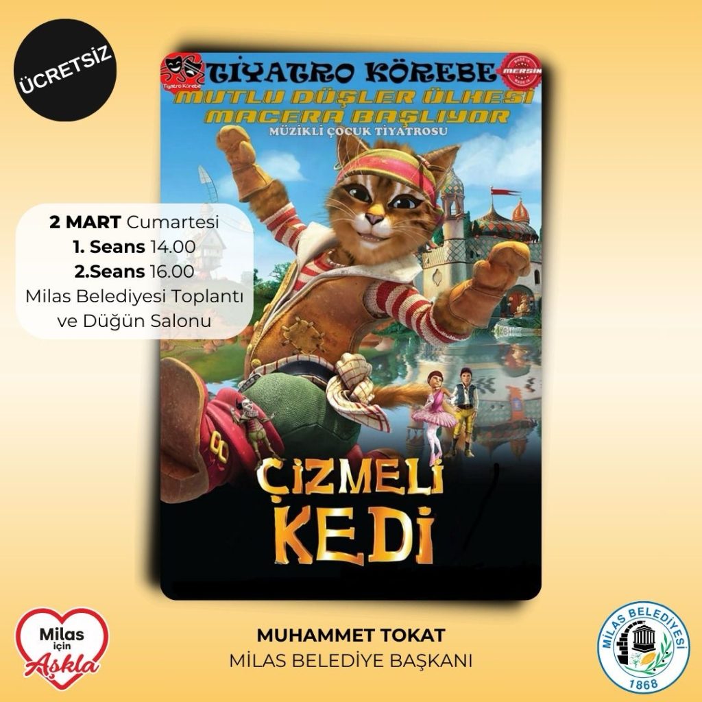 Milas Belediyesi’nin düzenlediği tiyatro etkinlikleri kapsamında 2 Mart Cumartesi günü saat 14.00 ve 16.00’da ‘Çizmeli Kedi’ isimli çocuk oyunu sahnelenecek. 4 Mart Pazartesi günü ise saat 20.00’de Necmi Yapıcı ve Nihan Durukan Yapıcı’nın sahne alacağı ‘Benimle Delirir Misin?’ isimli gösteri sunulacak. Tiyatro oyunları, Milas Belediyesi Toplantı ve Düğün Salonu’nda gerçekleştirilecek.