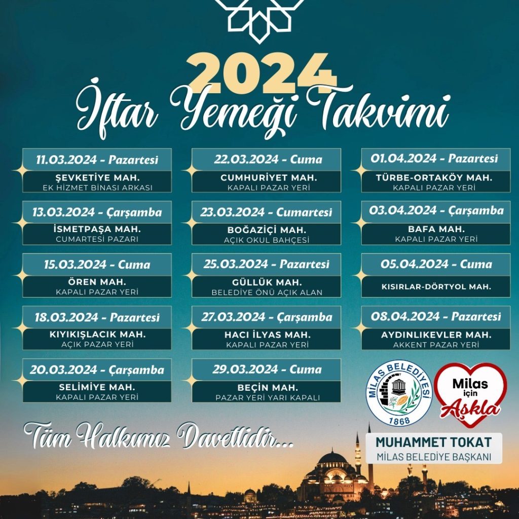 Şevketiye, İsmetpaşa, Ören, Kıyıkışlacık, Selimiye, Cumhuriyet, Boğaziçi, Güllük, Hacıilyas, Beçin, Türbe Ortaköy, Bafa, Kısırlar (Dörtyol), Aydınlıkevler Mahallelerinde gerçekleşecek iftar yemeklerine tüm vatandaşların davetli olduğu bildirildi.