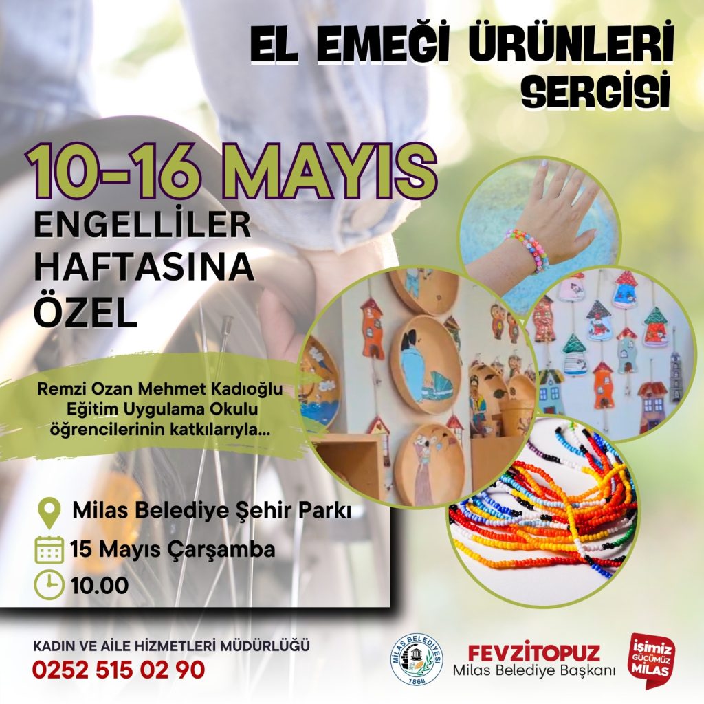 10-16 Mayıs Engelliler Haftası kapsamında, Remzi Ozan-Mehmet Kadıoğlu Eğitim Uygulama Okulu öğrencilerinin yaptığı el emeği ürünlerinin yer alacağı sergi açılışı yapılacak. Milas Belediyesi Kadın ve Aile Hizmetleri Müdürlüğü tarafındanhazırlanan etkinlik kapsamında, özel bireylerin yaptığı birbirinden güzel el emeği göz nuru ürün, vatandaşların beğenisine sunulacak.