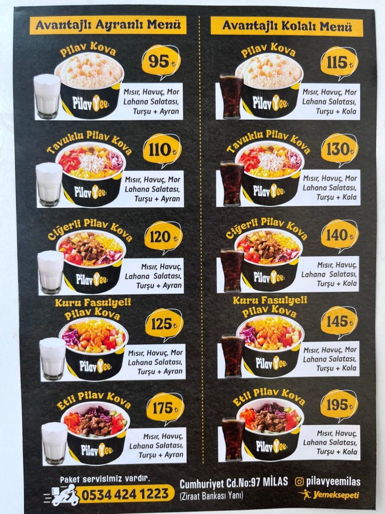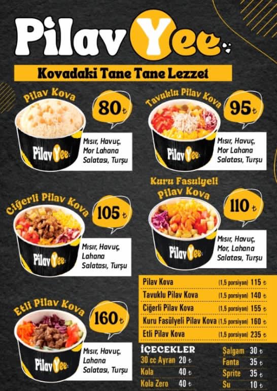 Menüsünde, Ciğerli Pilav Kova, Etli Pilav Kova, Tavuklu Pilav Kova ve Kuru Fasulyeli Pilav Kova gibi çeşitli lezzetleri barındıran işletme, şimdiden büyük ilgi görüyor. Her bir kova, özenle hazırlanmış ve lezzetiyle damaklarda unutulmaz bir tat bırakacak şekilde sunuluyor.
